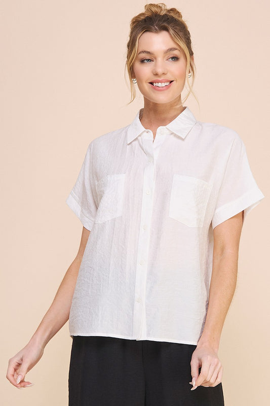 Flowy Textured Short Sleeve Button Front